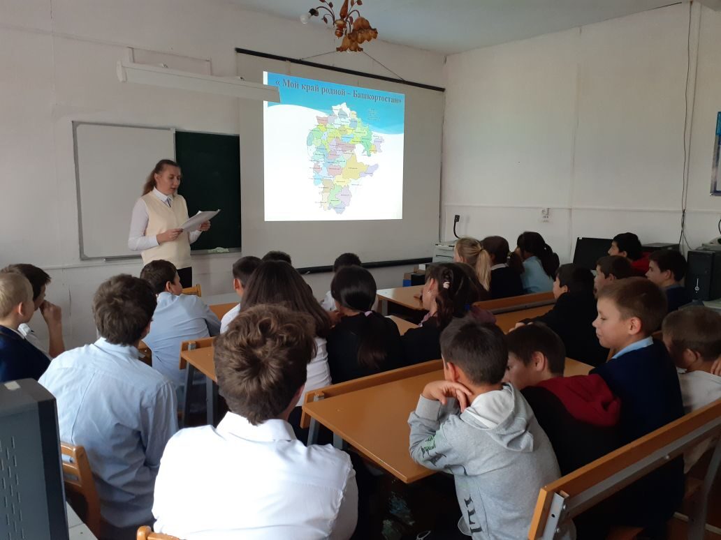 10 октября в школе прошло внеклассное мероприятие "Мой край родной - Башкортостан" для учащихся 5-11 классов, посвященное Дню Республики. Ребята узнали много нового, полезного и интересного про нашу Республику. Подготовила и провела завуч по ВР Мустафина Р.Ф. Было очень познавательно, ребята слушали с интересом.