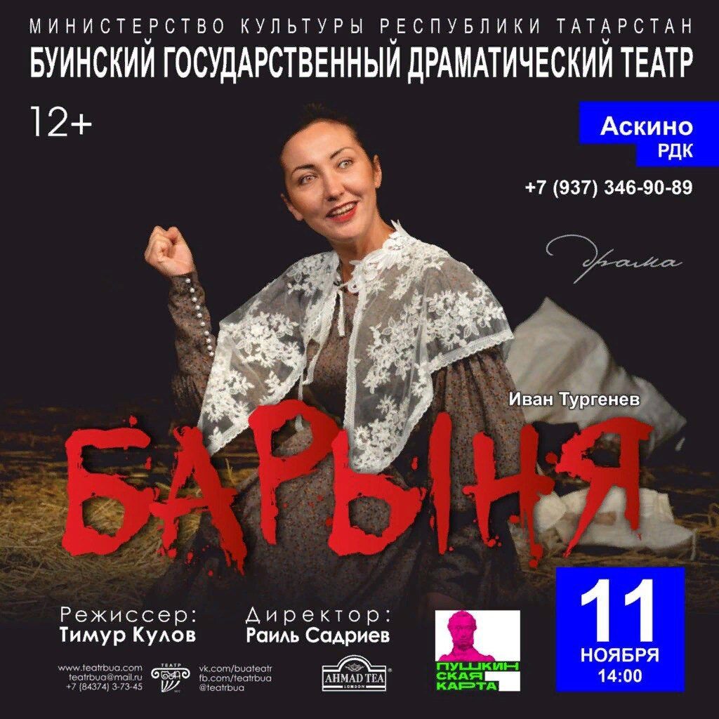 11 ноября учащиеся нашей школы посетили драму Ивана Тургенева "Барыня" благодаря Пушкинской карте. Перед учащимися выступил Буинский драматический театр Республики Татарстан. Ребятам очень понравился спектакль.